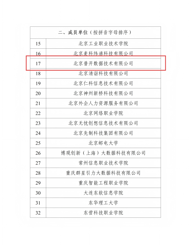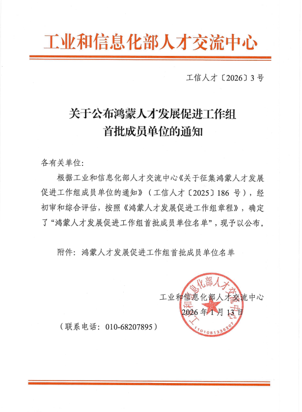 2026 年 1 月 13 日,工信部人才交流中心發布通知,公布鴻蒙人才發展促進工作組首批成員單位,北京普開數據技術有限公司(即普開數據)以成員單位身份入選,一同入選的還有 14 家發起單位與 125 家成員單位,覆蓋政產學研用多領域,旨在構建鴻蒙人才生態,助力鴻蒙生態高質量發展。