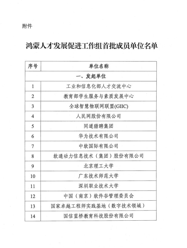 工信部公布鴻蒙人才發展促進工作組首批成員單位