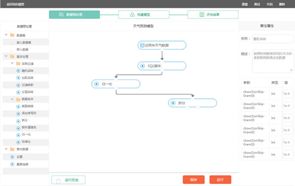 用戶全程無需編寫代碼即可完成機器學習計算任務。友好的WEB交互式界面,用戶可選擇算法,搭建包含數據預處理、特征工程及機器學習算法的工作模型,填寫算法參數并選擇計算資源,即可完成所設定的工作流程,由服務器計算任務結果并展示結果。