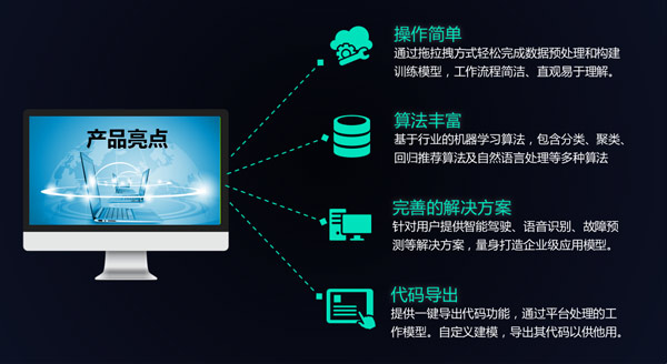 普開人工智能實驗室——操作簡單、算法豐富、支持代碼導出,提供多種企業應用級模型,基于行業的機器學習多種算法,通過拖拉拽方式輕松完成數據預處理和構建訓練模型,流程簡潔,直觀易懂,還體用一鍵導出代碼功能,通過平臺處理的工作模型自定義建模。